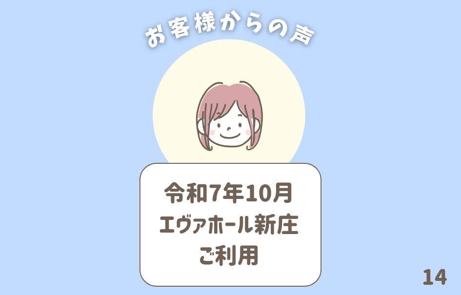 実際に当社をご利用いただいたお客様からの声をご紹介いたします! 令和7年12月 エヴァホール新庄ご利用 新庄市X様 アンケート本文 『親切丁寧な対応に感謝致します。スタッフの…