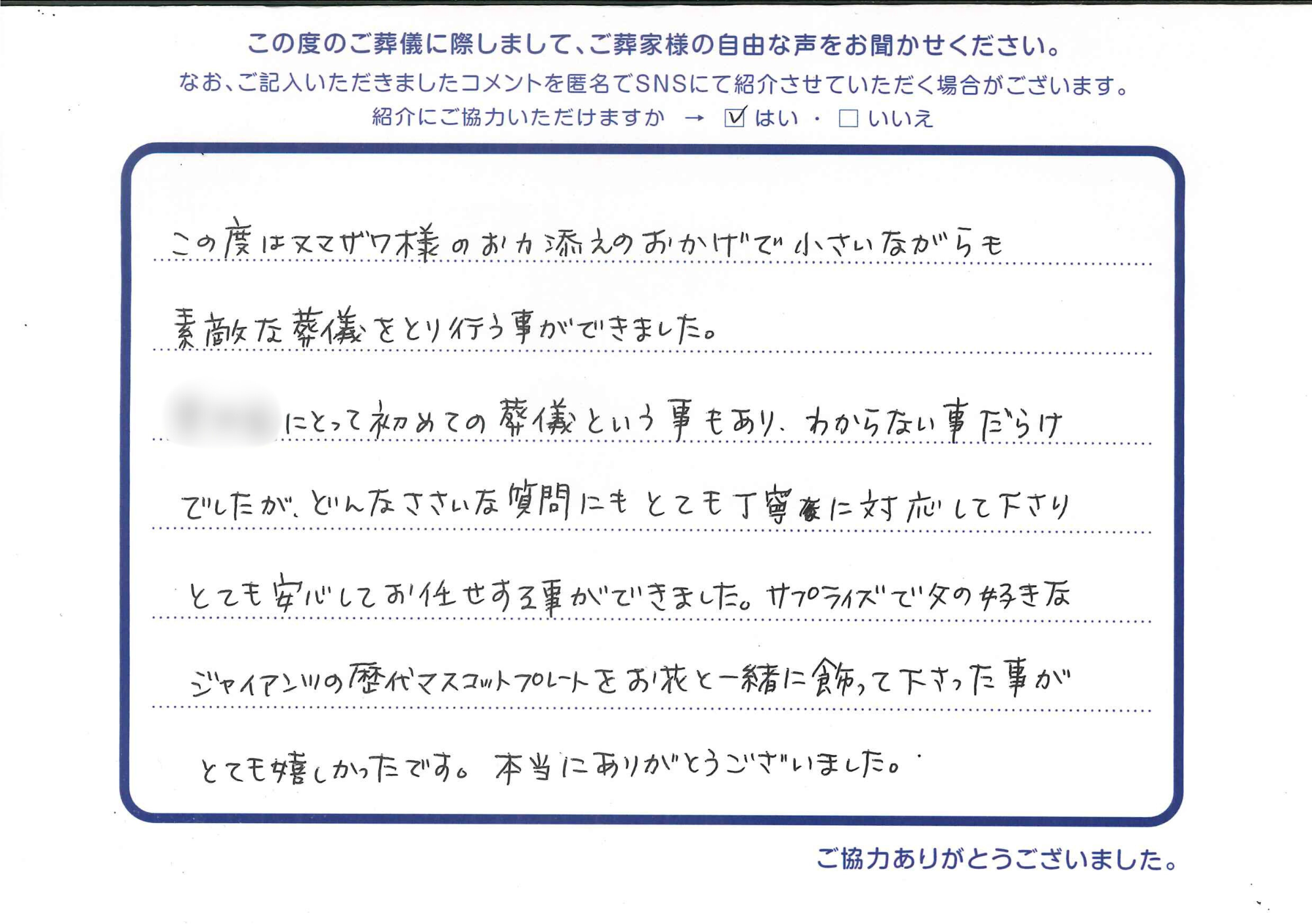 『この度はヌマザワ様のお力添えのおかげで小さいながらも素敵な葬儀をとり行う事ができました。初めての葬儀という事もあり、わからない事だらけでしたが、どんなささいな質問にもとても丁寧に対応して下さりとても安心してお任せする事ができました。サプライズで父の好きなジャイアンツの歴代マスコットプレートをお花と一緒に飾って下さった事がとても嬉しかったです。本当にありがとうございました。』