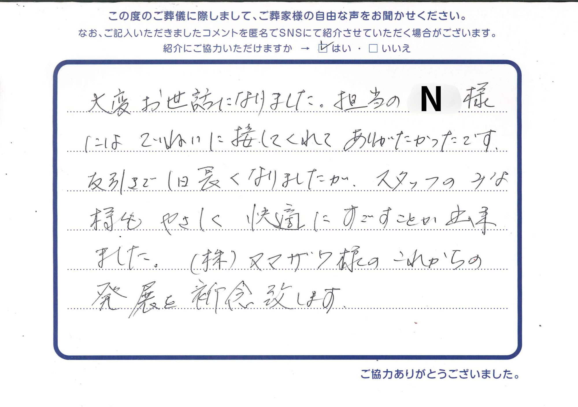 『大変お世話になりました。担当のN様には丁寧に接してくれてありがたかったです。友引で1日長くなりましたが、スタッフの皆様も優しく快適に過ごすことが出来ました。(株)ヌマザワ様のこれからの発展を祈念致します。』