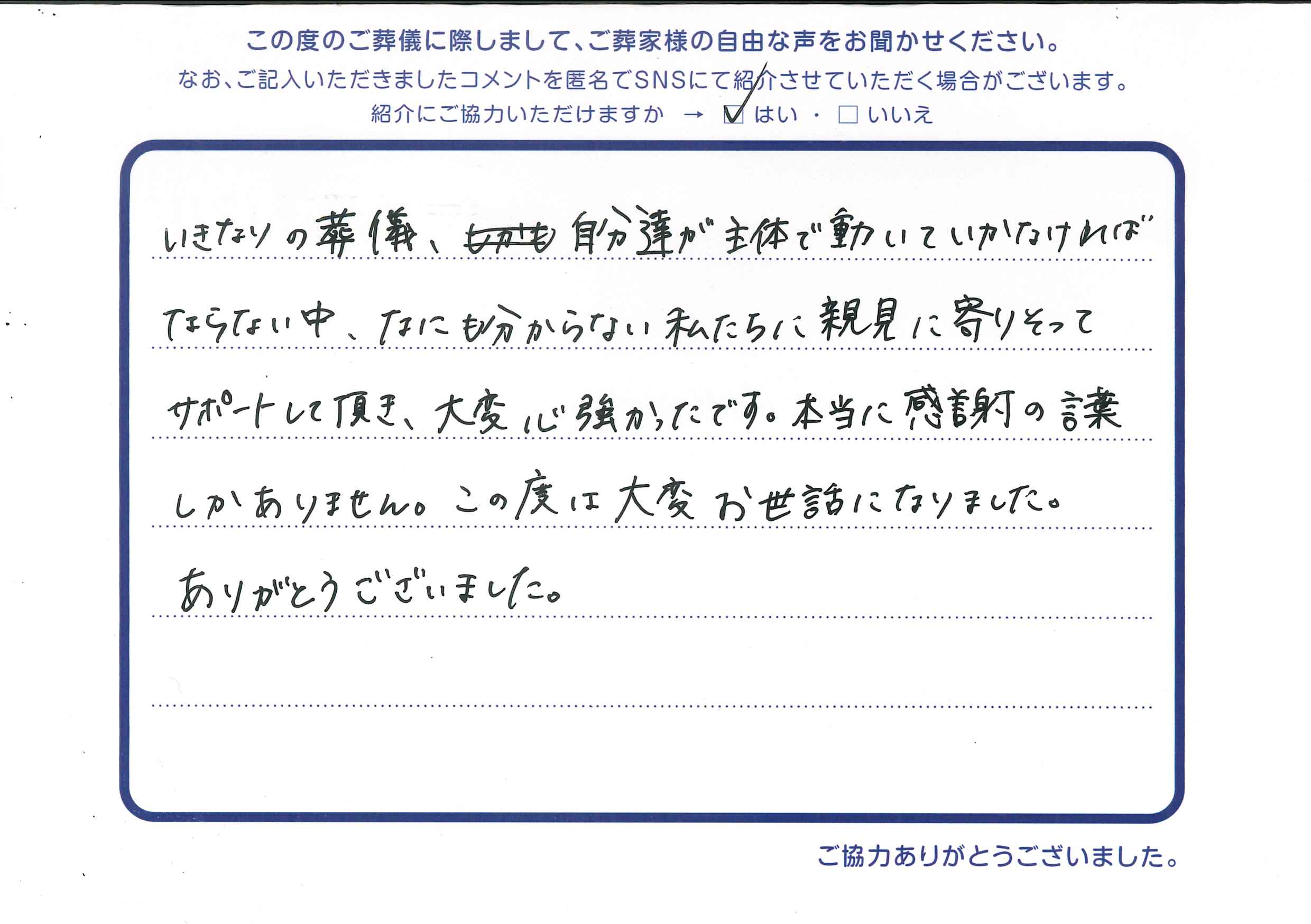 『いきなりの葬儀、自分達が主体で動いていかなければならない中、なにも分からない私たちに親身に寄り添ってサポートして頂き、大変心強かったです。本当に感謝の言葉しかありません。この度は大変お世話になりました。ありがとうございました。』