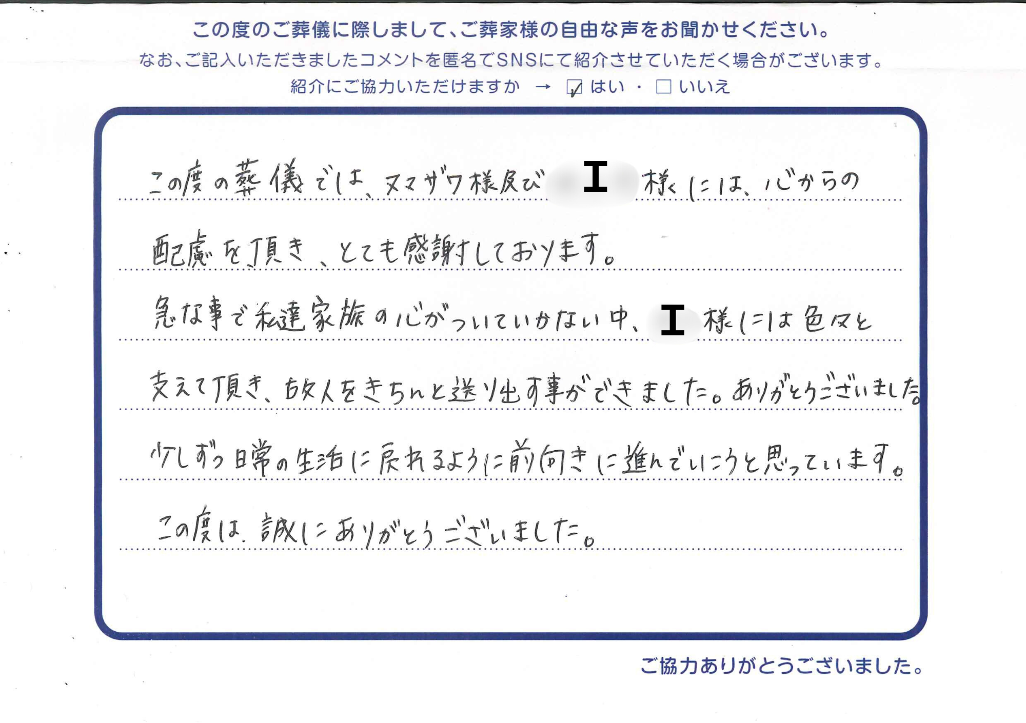 『この度の葬儀では、ヌマザワ様及びI様には、心からの配慮を頂き、とても感謝しております。急な事で私達家族の心がついていかない中、I様には色々と支えて頂き、故人をきちんと送り出す事ができました。ありがとうございました。少しずつ日常の生活に戻れるように前向きに進んでいこうと思っています。この度は誠にありがとうございました。』