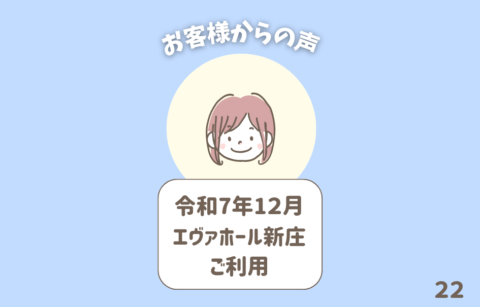 実際に当社にいただいたお客様からの声をご紹介いたします! 令和7年12月 エヴァホール新庄ご利用 新庄市V様 アンケート本文 『突然のことで、悲しみの中にいた私達の気持ちをく…